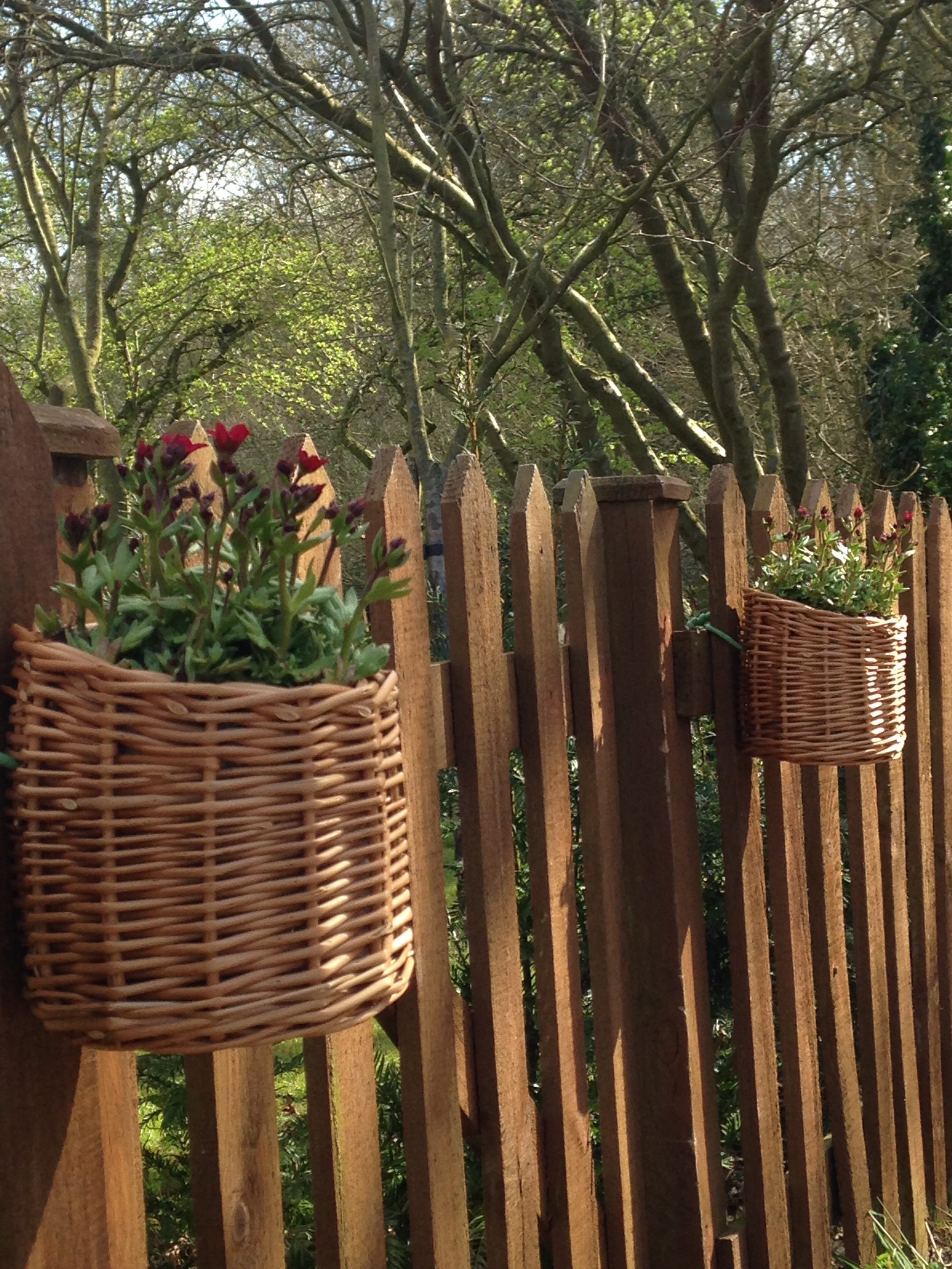 I thought I’d start by sharing these, a couple of little baskets I made to hang either side of the front gate. They add a certain something and break up the monotony of the fence whilst we wait for the bedding plants to take off. Initially, I planted them up with a couple of pink Saxifrage, which complimented the colour of the house nicely. When they cried out for more room I popped them in the garden and replaced them with type of yellow daisy which haven’t enjoyed the location quite as well…it probably hasn’t helped that I keep forgetting to water them in this hot weather.