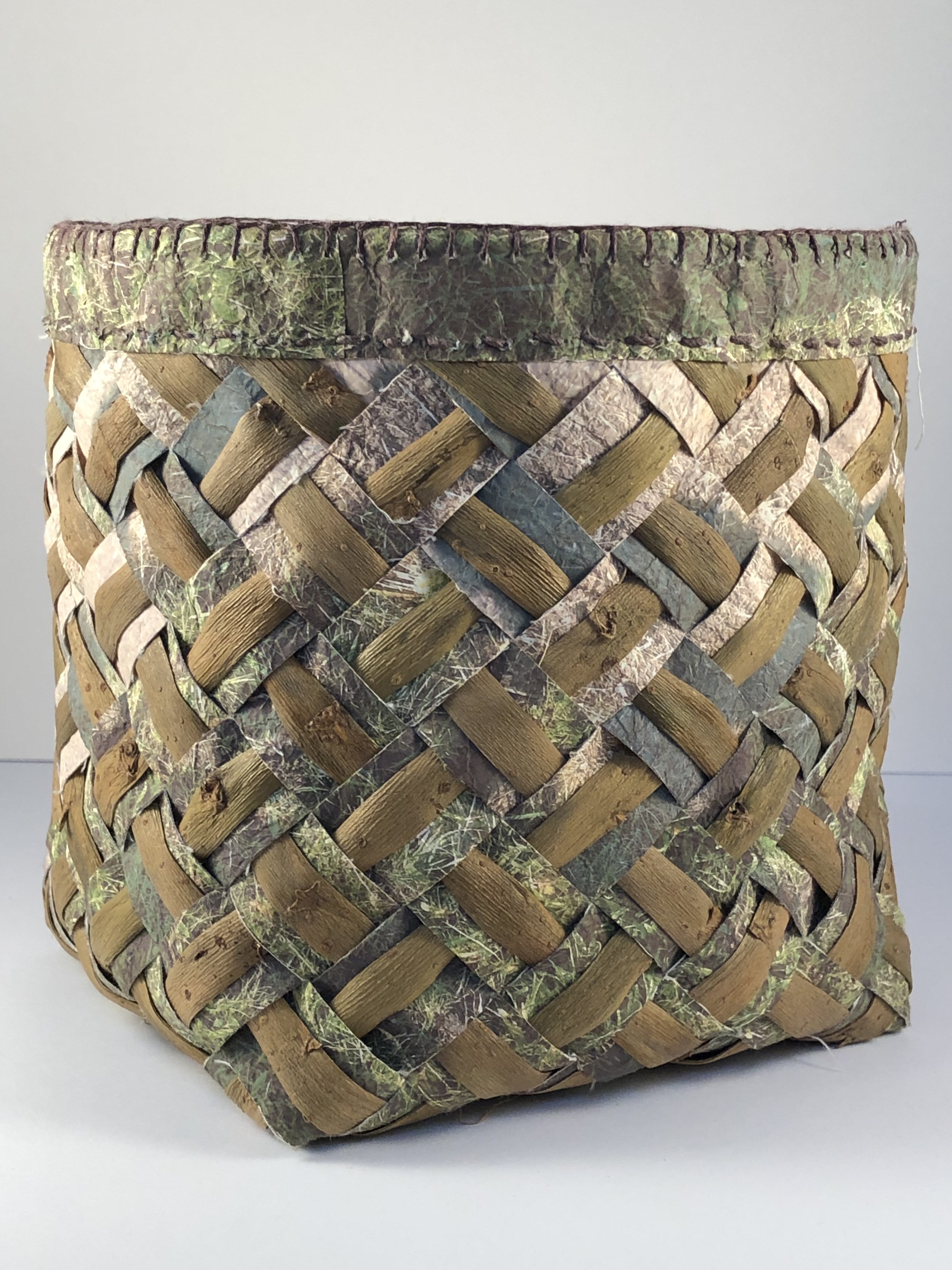It’s a beautiful walk with views I never tire of. I printed the photo onto paper, then soften it up by scrunching it up multiple times. Then I bonded it to canvas before cutting and plaiting. The border is a simple sandwich and sew and the whole thing is cradled in an overlay of willow bark.